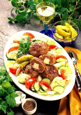 Cut the feta cheese into 8 cubes. Form 8 meatballs from the minced dough, pressing 1 sheep's cheese cube in the middle of each. Heat the oil in a pan and fry the meatballs for about 10 minutes.