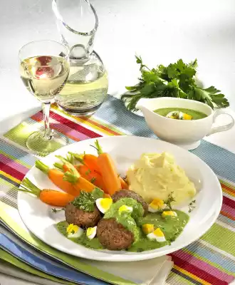Season to taste with salt, pepper and sugar. Chill for 1 hour. Meanwhile boil 4 eggs hard for 10 minutes, quench, peel and let them cool down. Knead minced meat, 1 egg, breadcrumbs and remaining onion, season with salt, pepper and paprika. Form 12 small meatballs from it. Clean the carrots, leaving a part of the green. Wash the carrots, dab dry and cut in half lengthwise. Heat oil in a pan and fry the meatballs on each side for about 5 minutes. Cook the carrots in boiling salted water for 8-10 minutes. Meanwhile bring 375 ml water to the boil, add cold milk and fat. Stir in the puree flakes briefly.