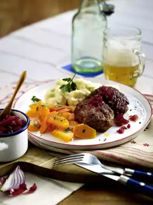 Arrange meatballs with onion confit, mashed parsnips and parsley-carrots on plates. Garnish with parsley. Add the rest of the meatballs and onion confit.
