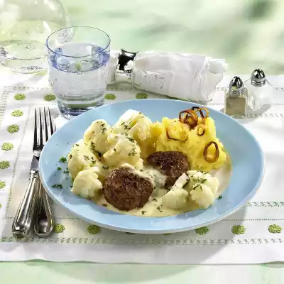 In the meantime, heat the oil in a coated pan and fry the meatballs for about 8 minutes, turning them over. Finally, add onion rings to the hot pan and fry until golden brown. Keep warm. Pour the cauliflower onto a sieve, collect the vegetable water and measure 3/8 litres.