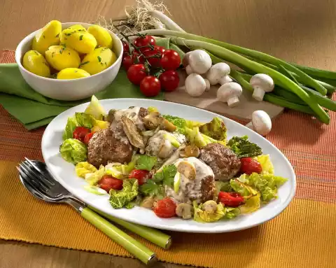 Clean and trim the mushrooms. Clean, wash and cut spring onions into rings. Wash the tomatoes. Clean, wash and cut cabbage into strips. Peel potatoes and cook in boiling salted water for about 15 minutes. Heat the fat in a saucepan and fry the remaining onion cubes. Add savoy cabbage and tomatoes, fry them and add 250 ml broth. Cover and cook over medium heat for about 12 minutes. Heat the oil in a frying pan, fry the meatballs in portions all around for about 12 minutes at medium heat. Remove and keep warm. Fry the mushrooms in the frying fat, deglaze with 250 ml stock and cream and bring to the boil. Let it boil down for about 5 minutes.