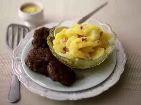 Cut potatoes into slices. Heat 1 tablespoon of oil in a pan. Leave the bacon in it until crisp. Add half onions. Add stock and vinegar, season to taste with salt and pepper, heat up briefly. Pour hot marinade over the potatoes and mix everything well. Let the potato salad cool down for at least 1 hour and let it soak through. For the meatballs, knead minced meat, remaining onions, breadcrumbs, mustard and egg. Season with salt and pepper. Shape into 12 small meatballs.