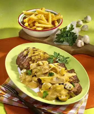 Heat 1 tablespoon of oil in a pan and fry the onion and mushrooms until golden brown. Deglaze with cream and broth and bring to the boil. Add sauce thickener, bring to the boil again briefly. Season to taste with salt and pepper. Cut the roast open and serve with the sauce. Serve garnished with parsley. French fries taste good with it