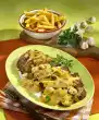 Remove and set aside. Fry the rest of the onion-garlic mixture in the frying oil. Deglaze with broth. Add cream and bring to the boil. Stir cornflour and 2 tablespoons of water until smooth. Stir into the sauce and bring to the boil again.
