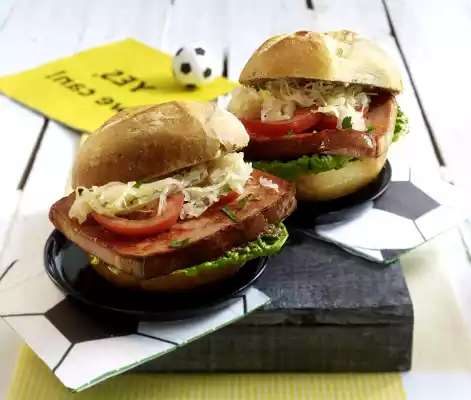 Wash parsley, shake dry, pluck leaves from the stalks and chop. Cut the rolls in half. Spread 1/2 tsp. mustard on each half. Cover the lower halves of the rolls one after the other with 1 lettuce leaf, 1 slice of meat loaf, 2 slices of tomato and sauerkraut.