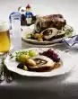 If necessary, pour on 1 tbsp. of skimmed duck fat again in between. Place the meat on the baking tray with the duck. Cook in the preheated oven (electric cooker: 100 °C/circulating air: not suitable/gas: not suitable) for 1 1/4-1 1/2 hours.