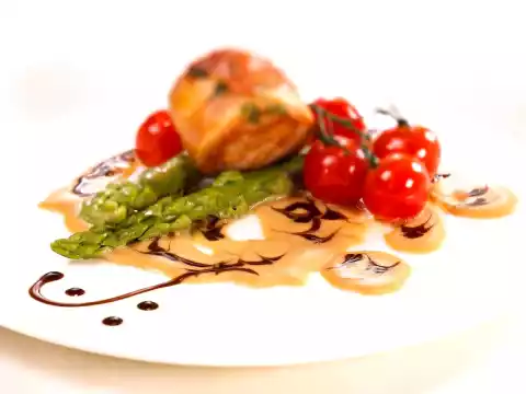 Add the balsamic cream drop by drop. Use a wooden skewer to draw streaks. Arrange asparagus, medallions and tomatoes on it.