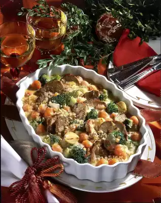 Put the vegetables and meat in a greased baking dish. Pour sauce over it. Add 1 tablespoon butter in flakes and crumbs. Place in a preheated oven (electric cooker: