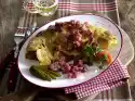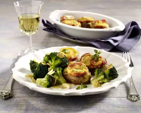 Melt the butter in a pan and roast the flaked almonds in it until golden brown. Bake the medallions under the hot grill for 3-4 minutes. Drain the broccoli and mix with the almond butter. Serve everything.