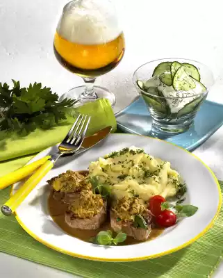 Garnish medallions and sauce as desired with marjoram and halved cherry tomatoes. Sprinkle mashed potatoes with parsley. Serve on plates. Serve with cucumber salad extra.
