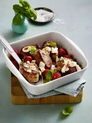 Wash the tomatoes and add to the meat. Crumble goat's cheese over it. Bake in a preheated oven (electric cooker: 225 °C/ convection oven: 200 °C/ gas: see manufacturer) for approx. 10 minutes. Wash basil, shake dry and pluck leaves from the stalks.