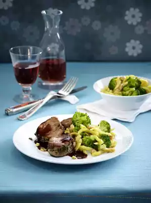 Drain the spaetzle and broccoli. Mix with butter and nuts, season. Serve with meat and sauce.