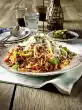 Add the rest of the vegetables, then season with salt, pepper and a little sugar. Let the sauce simmer for 3-4 minutes. Drain the pasta and mix with the sauce. Arrange noodles and garnish with herbs.