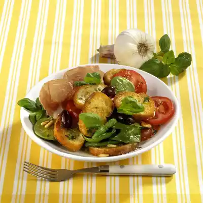 Heat olive oil in the same pan. Fry the baguette slices briefly on each side, sprinkle with thyme. Mix the bread slices with the salad. Serve in portions with Parma ham, pine nuts and olives.