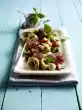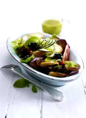 In the meantime clean and wash the zucchini and slice them into thin slices. Wash and clean the tomatoes and cut them into thin slices. Clean and wash the salad and pluck into bite-sized pieces. Mix lettuce, tomatoes, zucchini and olives carefully in a bowl.