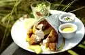 Wash the fish, pat dry and cut into 4 pieces. Season with salt and pepper. Place the fish on the tomato ragout, cover and continue steaming over a low heat for 6-8 minutes. Drain potatoes and arrange with fish and tomato ragout.
