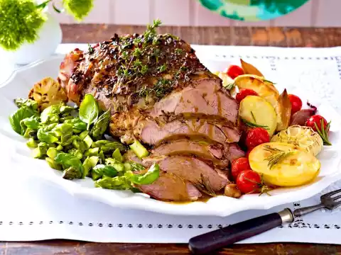 Wash the rosemary, dab dry and remove the needles. Peel, wash and halve the potatoes. Mix everything with 1-2 tsp. sea salt and oil. Spread around the meat. Bake in the oven for 1 3/4 hours.