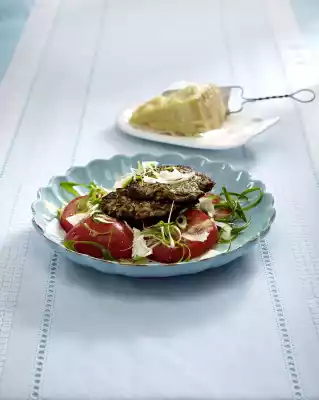 Spread a thin layer of oil on a coated pan. Fry the meatballs for approx. 8 minutes while turning. Arrange tomatoes, spring onions and meatballs. Drizzle tomatoes with prepared salad dressing. Slice Parmesan cheese over it
