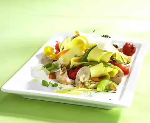 Drain the pasta and put it in a bowl. Add avocado, walnuts and vegetables and mix. Arrange on 4 plates and garnish with Parmesan shavings.