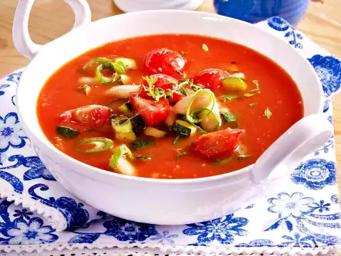 Wash and clean spring onions. Cut the green and white part separately into rings. Peel and roughly chop the garlic. Heat 1 tablespoon of oil in a pot. Sauté lightly onion rings and garlic for 2-3 minutes, then stir in tomato paste. Sweat tomato paste for 1-2 minutes, add stock and tomatoes. Season with salt, pepper, paprika and some sugar and let simmer covered for about 20 minutes.