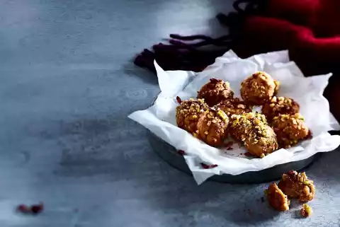 When the first tray is in the oven, bring sugar, honey, 200 ml water, cinnamon stick and orange peel to the boil. Simmer for about 3 minutes. Keep syrup warm. Finely chop and mix walnuts, rose petals and pistachios. Remove the cookies and add them in portions to the syrup for 3-5 minutes. Lift out, drain and turn in the nut mixture. Let them cool down.