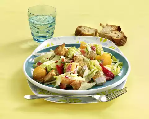 Wash the meat, dab dry and cut into cubes. Heat the oil in a coated pan and fry the meat for about 4 minutes until golden brown, seasoning with salt and pepper. Halve melons and remove seeds. Cut out the flesh with a ball cutter. Wash, clean and slice the strawberries. Clean, wash and cut the salad into strips.