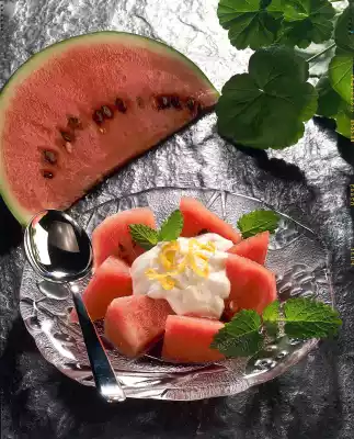 Season to taste with lemon juice. Arrange the melon cubes with the sauce. Serve decorated with lemon shavings and lemon balm.