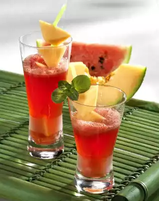 Cut Charentais melon into quarters, peel and remove seeds. Cut the fruit flesh into pieces of about 3 cm. Put on long skewers and freeze for about 1 hour. In the meantime cut watermelon into slices, peel and remove seeds. Dice the fruit flesh.
