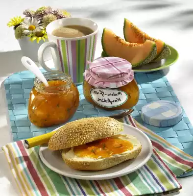 Put the peach and melon cubes in a pot and puree some of the fruit with a blender. Stir in jam sugar. Bring everything to the boil while stirring over high heat. Cook for at least 3 minutes while stirring constantly.