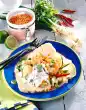Halve one melon wedge crosswise and arrange on plates with the remaining prepared ingredients and mortadella. Spread the marinade on top. Serve garnished with basil.