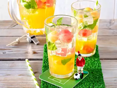 Place the melons with marinade and lemon balm in a suitable container. Fill up with ice cubes and pour champagne on top