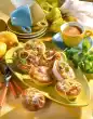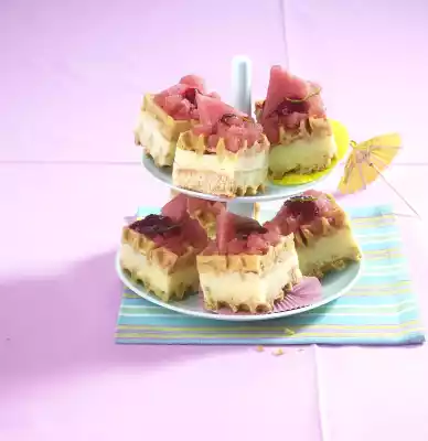 Freeze for 1 hour. Stir quark smooth and stir in. Line the bottom of a rectangular springform pan (23 x 23 cm) with waffles. Cut the waffles a little bit into shape. Spread honeydew melon mixture on top. Cover with waffles again and freeze for about 2 hours. Spread watermelon sorbet on top and freeze again for 1 hour. Cut the cake into pieces with a knife dipped in hot water. Drizzle with raspberry sauce.