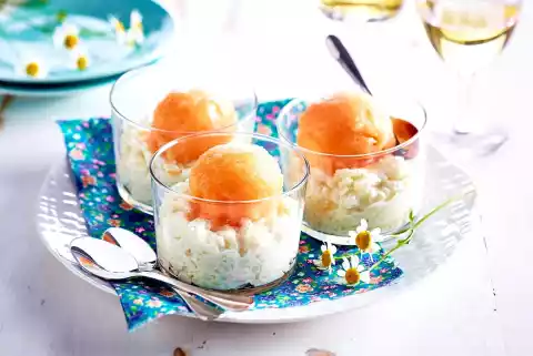 Whip the cream until stiff and stir into the rice pudding. Divide into six glasses. Cut out balls from the sorbet and arrange on the rice, serve immediately.