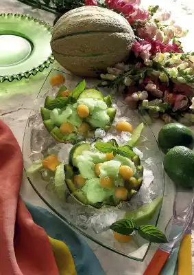 Halves may be arranged on crushed ice. Serve immediately, decorated with slices of lime, mint and other melon slices and balls.