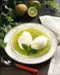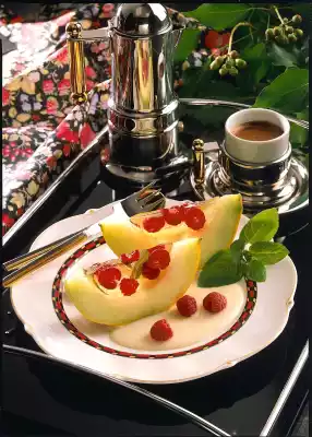 Let it cool down a little. Put half of the raspberries and some mint leaves into the melon halves, pour the wine over them. Leave to set in the fridge for about 3 hours. Take 3 tablespoons of the milk and stir the sauce powder into it until smooth.