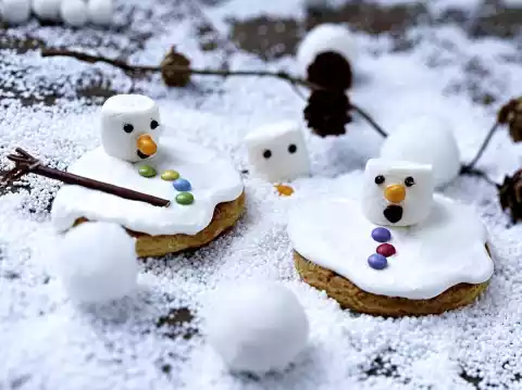 Mix icing sugar, egg white and lemon juice with the whisks of the mixer. For the head, stick 1 jelly bean as a nose on each marshmallow with a little bit of icing. Paint eyes and mouths on the marshmallows with sugar writing.