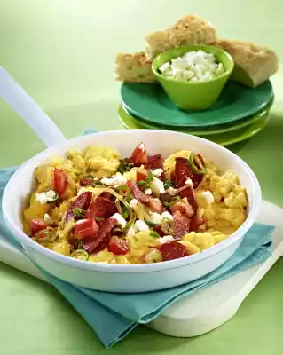 Whisk the eggs and season with salt and pepper. Heat a second pan and pour in the eggs. Let them falter at low heat, pushing them together again and again with a spatula. Arrange the scrambled eggs in a bowl. Add the sausage and vegetable pan and crumble the feta cheese over it. Flatbread tastes good with it