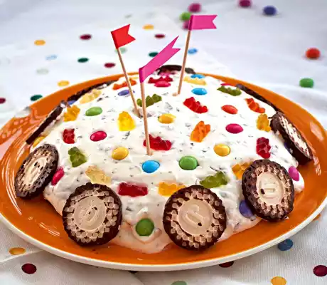 Decorate with foam kiss waffles, jelly bears and Smarties and serve with lots of love.