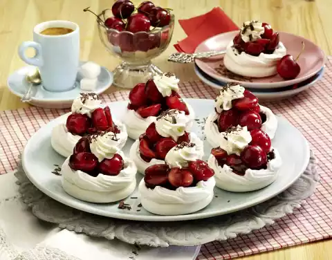Finely chop the chocolate coating and melt over a warm water bath. Brush the meringue tartlets with the chocolate coating. Shortly before serving, whip the whipped cream with the whisk of the hand mixer until stiff, allowing the cream hardener to trickle in. Fill the meringue tartlets with cherry groats, decorate with a dab of cream and sprinkle with grated chocolate