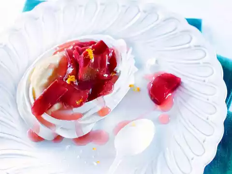 Spread the pudding into the meringue Easter egg wells and arrange on plates. Place some rhubarb compote on top and sprinkle with the remaining orange peel. Add the rest of the compote.
