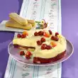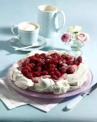 Pour the mixture into the middle of the circle and spread loosely. Place in the preheated oven (electric cooker 175 °C/ convection oven: 150 °C/ gas: level 2). Switch the temperature back (electric oven: 150 °C/ convection oven: 125 °C/ gas: level 1) and bake for approx. 65-75 minutes. Allow to cool down with the oven door open. Defrost frozen raspberries. Soak gelatine in cold water. Puree half of the raspberries and pass through a sieve. Mix with yoghurt and 75 g sugar. Dissolve the gelatine carefully, stir some cream into the gelatine, then stir everything into the remaining cream. Whip the cream until stiff and fold in. Carefully remove the base from the baking paper and place on a plate.