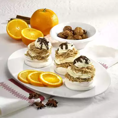 Whip cream and 1 sachet of vanilla sugar until stiff. Pour into a piping bag with star-shaped spout. Alternately squirt some cream onto the meringue and put the chestnut cream on top (if necessary press it through a potato ricer). Finish with a cream tuff