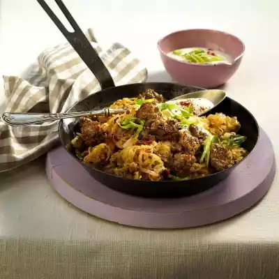 Drain the sauerkraut. Peel and roughly dice the onion. Heat the oil in a pan and fry the ground pork in it until it is very coarse and crumbly. Add onion and marjoram, fry briefly. Dust with chilli powder. Add sauerkraut, bay leaf and 200 ml water, bring to the boil and stir in the stock.