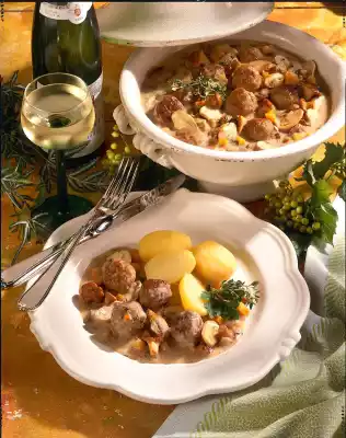 Dust with flour and sweat. Deglaze with 3/8 l water, wine and cream. Bring to the boil, stir in stock and thyme. Add the carrot, let everything simmer for about 5 minutes. Season to taste. Add meatballs and heat. Add: Boiled potatoes