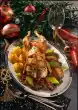 Form ground pork into small balls. Fry in 2 tablespoons of hot oil for about 10 minutes. Peel and wash the potatoes. Cut into slices. Pluck rosemary needles from the branch.