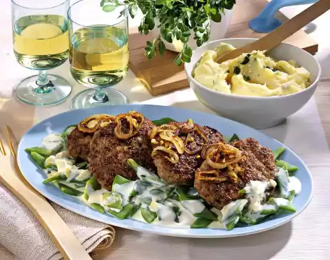 Arrange the beans with the mead steaks on a plate and spread the onion rings on top. Serve puree separately. Heat the rest of the fat, sauté the remaining marjoram in it and put it on the puree.