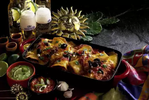 Grate cheddar cheese and mix with the cottage cheese. Cut olives into slices from the stone. Season tomato sauce with salt and cumin. Heat the remaining lard in portions. Stir the flat dough again and add four tablespoons of dough per flatlet to the pan and smooth it down. Bake the flat cakes for two minutes on each side. Bake eight flat cakes. Spread the finished flat cakes with two tablespoons of tomato sauce each. Spread the minced meat, 2/3 of the olives and the cheese mixture on top and roll up. Place in an ovenproof dish (30 cm long). Spread the rest of the sauce, olives and cheese mixture over it and bake in a preheated oven (electric cooker: 200°C/ gas: level 3) for 15 minutes. For the dips, carve chilli, remove seeds. Wash the pods and cut into rings. Peel and chop onion and garlic. Cut avocado in half, remove stone. Peel avocado and chop roughly.