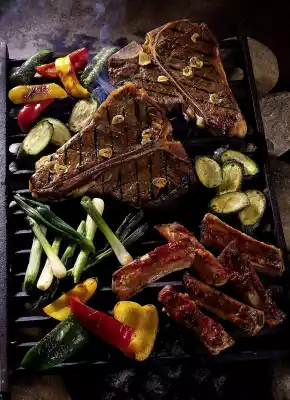 Clean and wash the vegetables. Cut peppers into strips, spring onion into longer pieces and zucchini into slices. Mix olive oil and lime juice. Season with salt and pepper. Remove the steaks from the marinade and grill for about 5-8 minutes on each side.