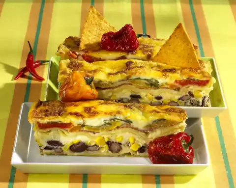 Place 3 lasagne plates next to each other. Layer bean-corn mixture, half the sauce, another 3 lasagne plates, salami, paprika vegetables and the rest of the sauce. Sprinkle with remaining grated cheese. Bake in the preheated oven (electric cooker: 200 °C/ convection oven: 175 °C/ gas: level 3) for about 45 minutes.