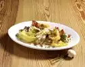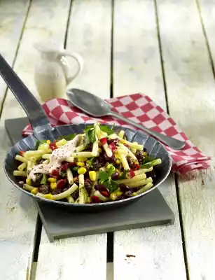 Cut the leaves into rough strips. Mix sour cream and approx. 1 tbsp. tomato paste. Season to taste with salt, pepper and paprika. Season pasta pan with salt, pepper and paprika. Mix in parsley.